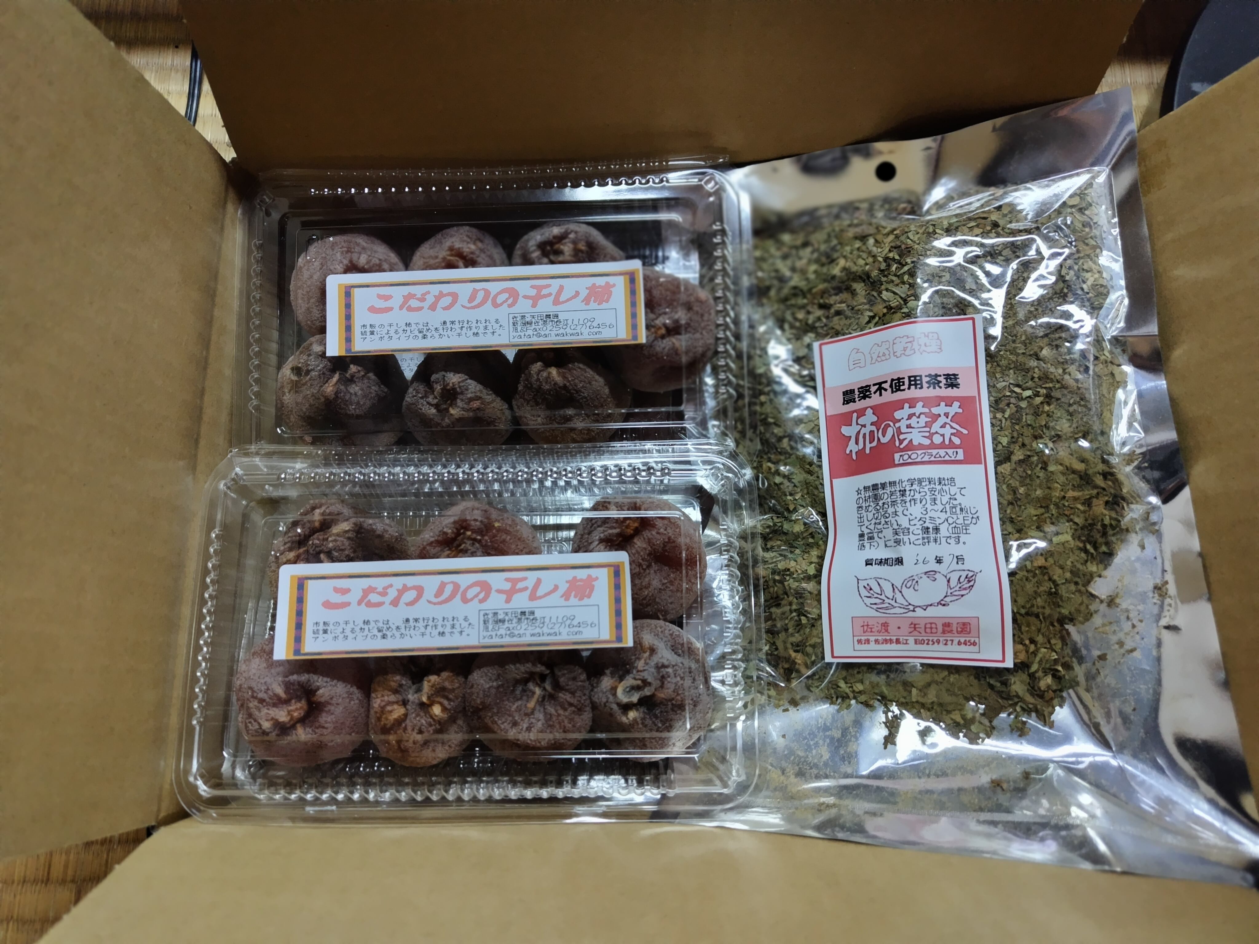 当園の干し柿 4パックと柿の葉茶100g 2袋のセットです。
